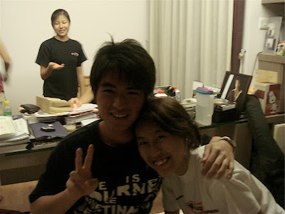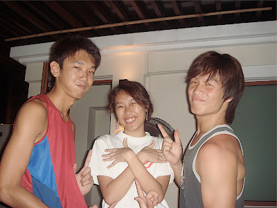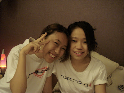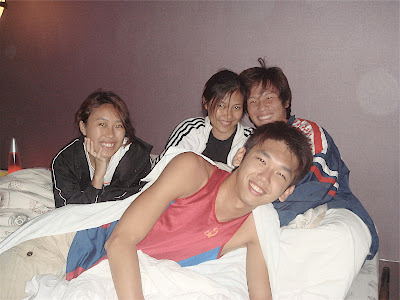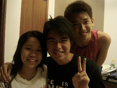 so we went to yao's room after tt... mao is crazy on the com man, the way she plays diablo is like she's a guy... haha, while the manly guys (ie shawn john n yao) were busy watching some morbid wrestling show, e rest of us were listening to music n chilling out on the bed. so comfy. we played strip poker too haha supposed to strip but in the end everyone shoved toys up their pockets n used them to bet. i used up my ear rings, rubber band, and camera already.... i was so not going to strip. haha, apparently john isabel n shawn didnt want to also (y did we start with the game in the 1st place? haha) so we switched to taitee. lucky i didnt lose many times. haha, i think my taitee improved! haha